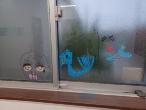 窓お絵描きには好きなキャラクターや動物と共に来月に向けて雨などを描きました☔
