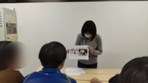 事業所に戻ってきてからは、地震について学びました。VR映像をみて、実際に地震が起こるとどうなるのかを確認し、みんなで地震が起こったら、どんな行動をすればいいのか話し合いました。最初は「わからない」と答える子もいましたが、他のお友だちが「机の下にもぐる!」「窓を開ける!」「カーテンを閉める!」など意見がたくさんでると、「わからない」と言っていた子もこうすればいいんだ!と理解を深めることができました。