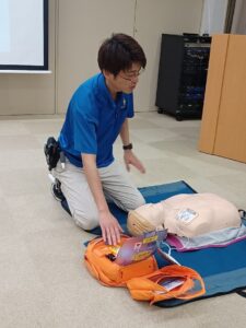「人が倒れています!」「周囲の安全よし!」「大丈夫ですか?」「誰か来てください!」「あなたは119番をお願いします。あなたはAEDをお願いします」「1・2・3・・・(呼吸の確認)」の実践をしました。
