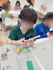自分の席に座って、画用紙などの材料をハサミで切っていきましょう。