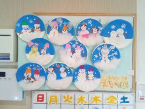 カレンダー制作では紙皿と綿を使って雪だるまの制作を行いました~❕