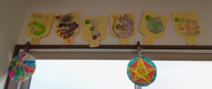 壁面制作はお正月をイメージして羽子板と花紙をくるくるまいた今年の干支であるへびの制作をしました~❕🐍🪄