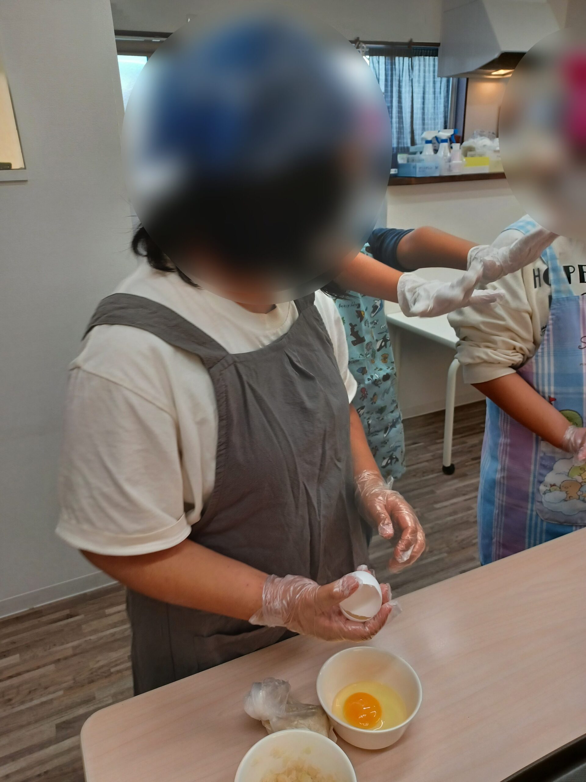こぼさずに材料を入れるためにお友だちと協力したり、誰が卵を入れるのかを相談したり・・・。