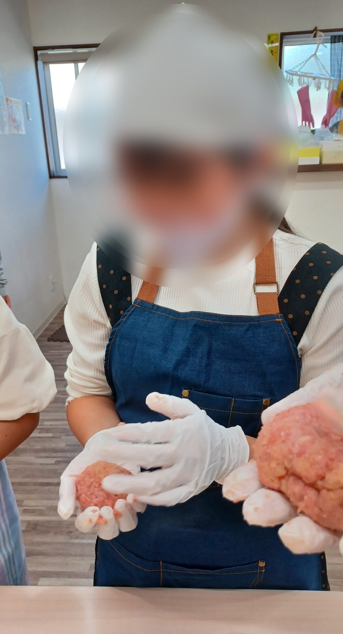 形を整え、ハンバーグの真ん中に窪みを作ります。生焼けの危険性や窪みを作る理由なども説明し、後は焼くだけ!!