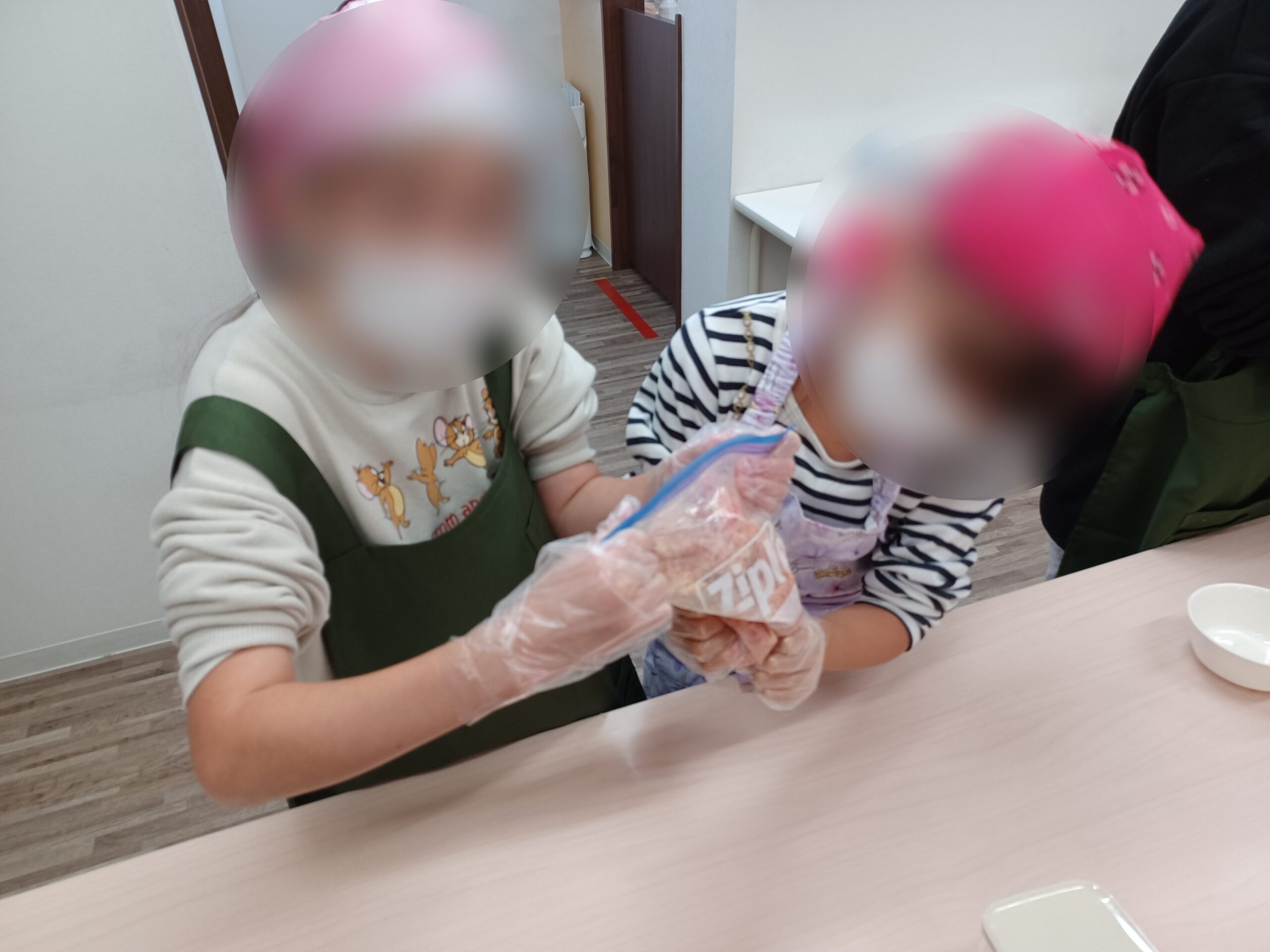 卵を割る時はみんなドキドキしながら割っていましたが、殻も入らず上手に割ることができました。袋の中でこねる時にはやわらかい感覚を楽しんでいました。