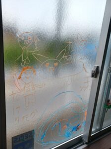 窓お絵描きには好きなキャラクターや動物と共に来月に向けて雨などを描きました☔
