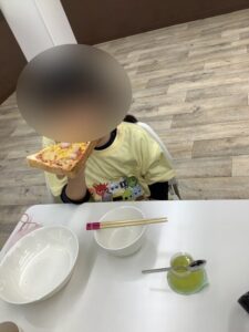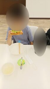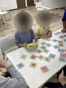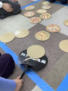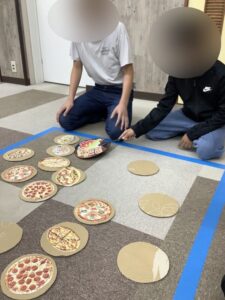 そして焼けるのを待つ間、食育の日ということで”パクモグ”というアナログゲームと、ピザを作る人と食べる人に分かれた”ピザひっくり返しゲーム”を行いました😊
