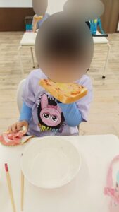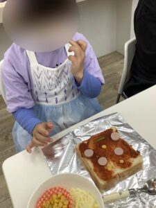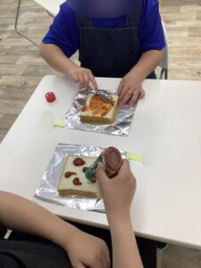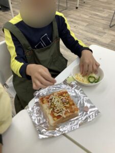 ピザソースを伸ばした後、具材をちぎって同じ大きさにする子や顔の形に並べる子など思い思いのトッピングができました🥰