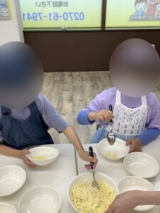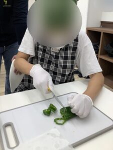 ・ウインナーを切るチーム・ピーマンを切るチーム・チーズを分けるチーム・コーンを分けるチーム