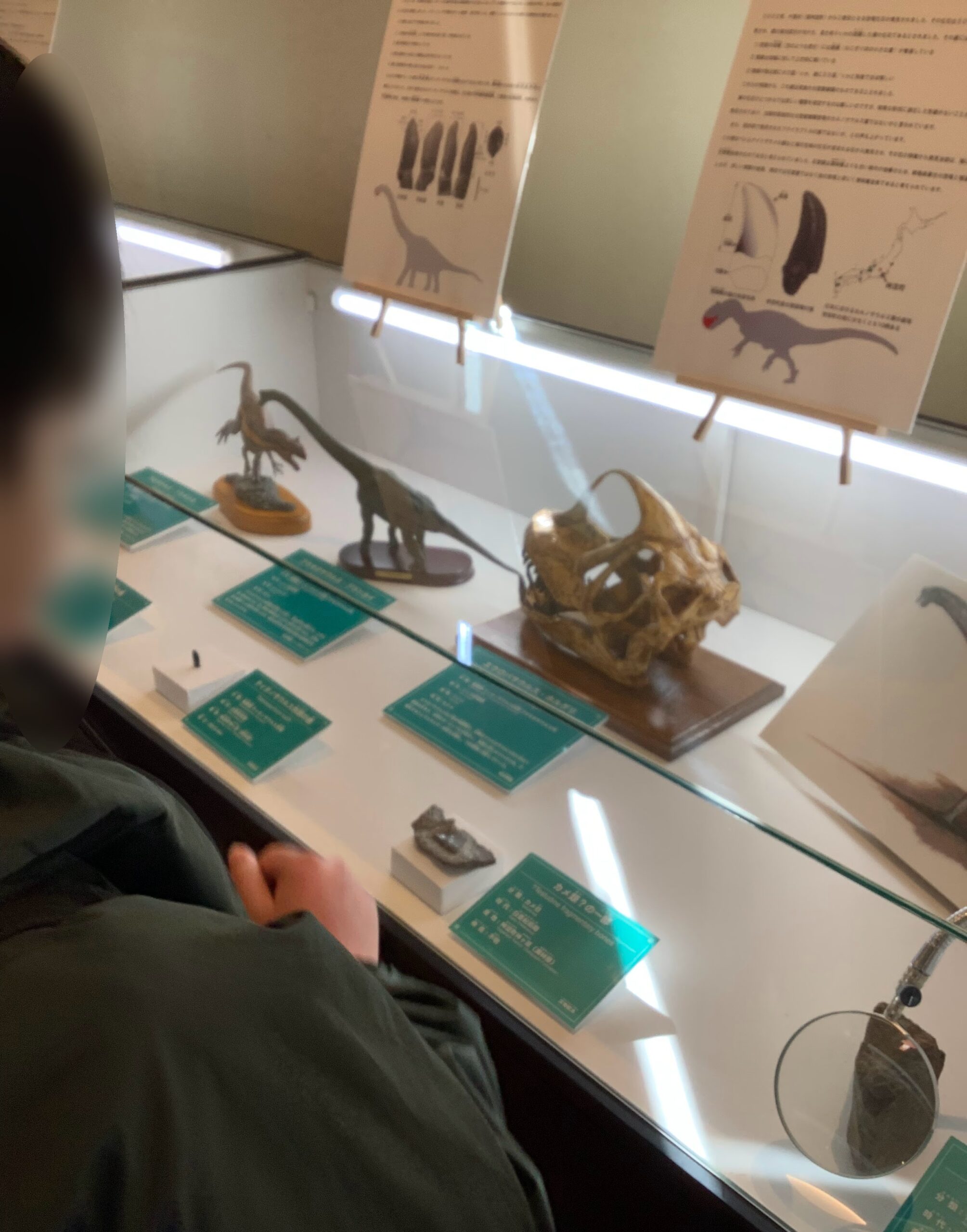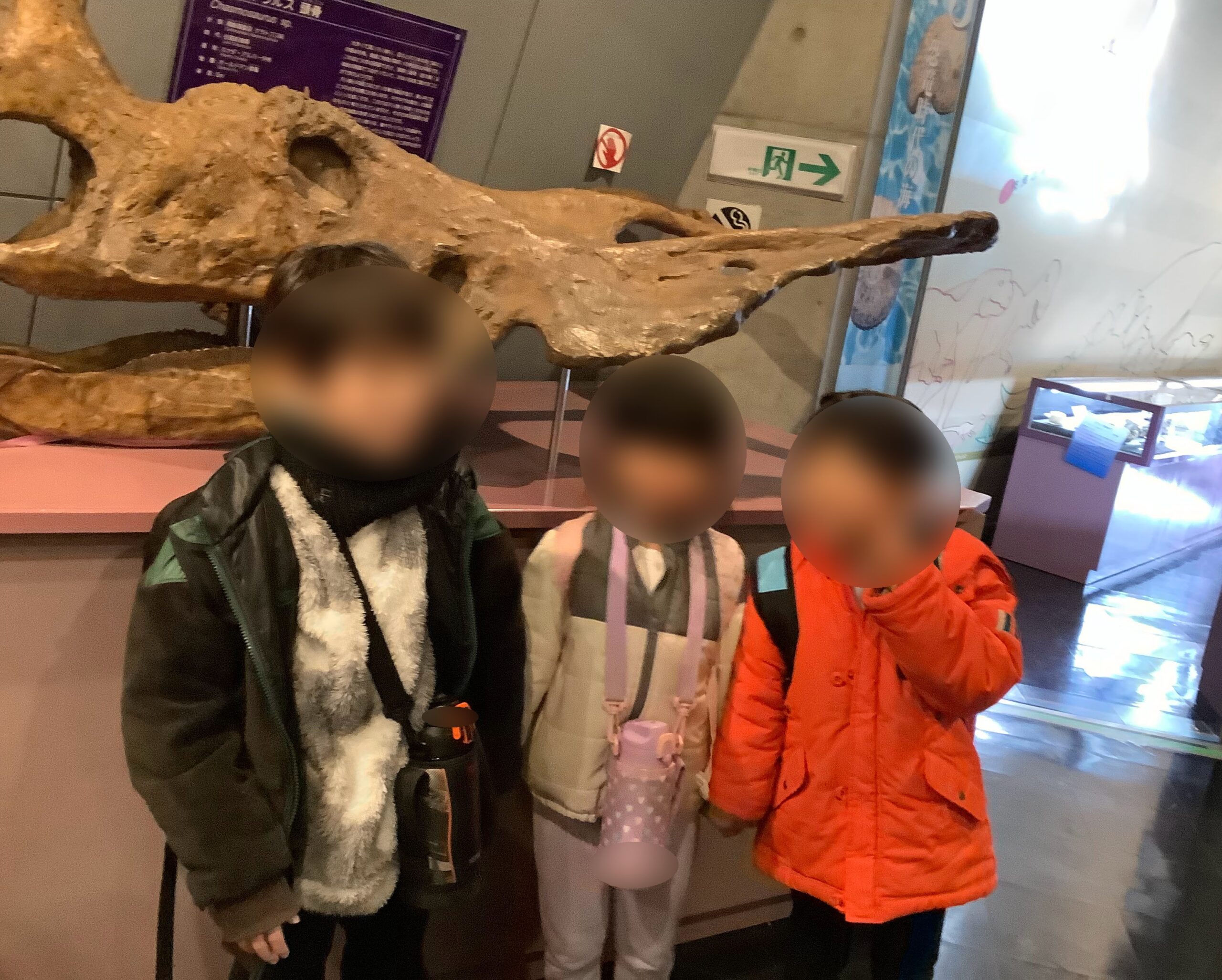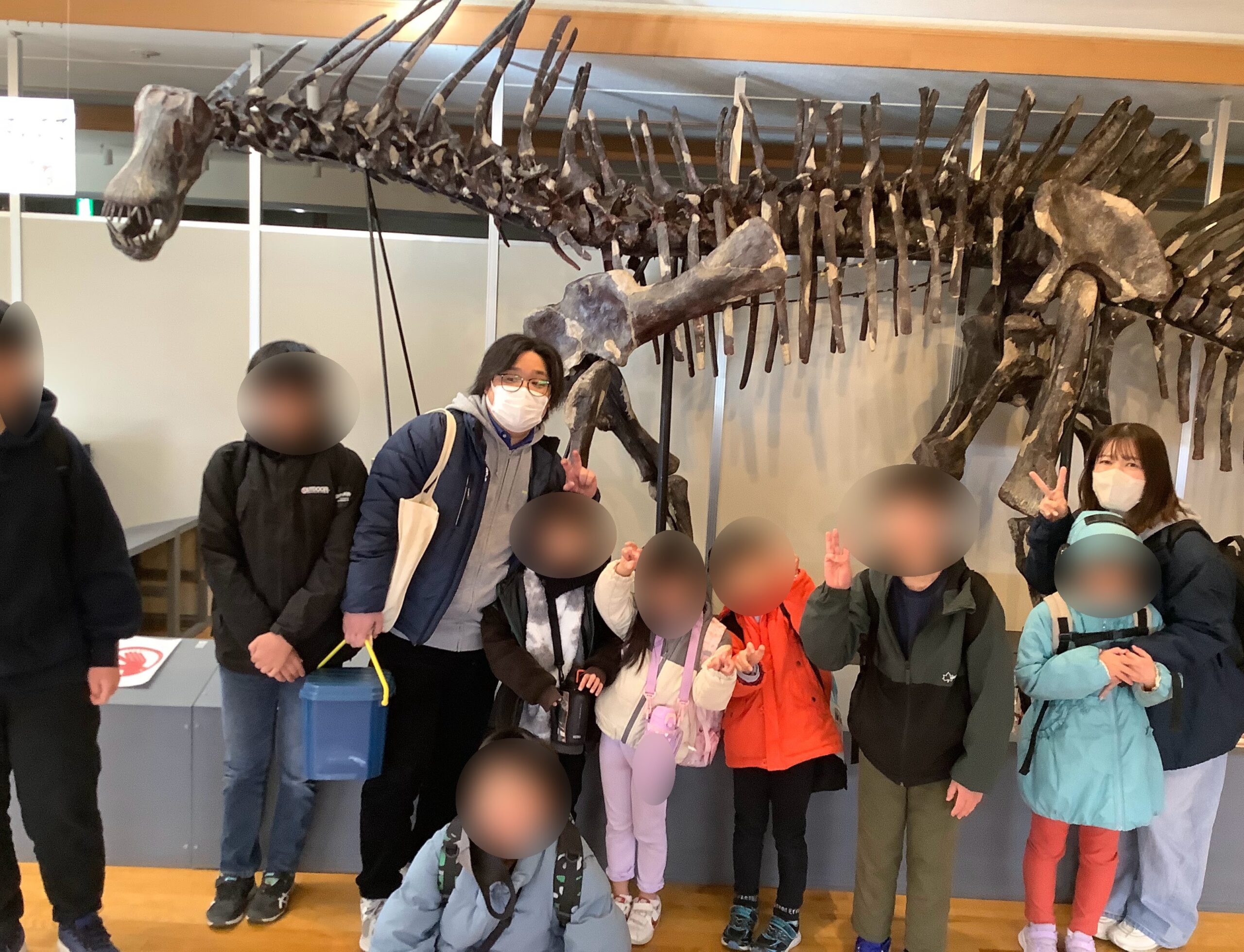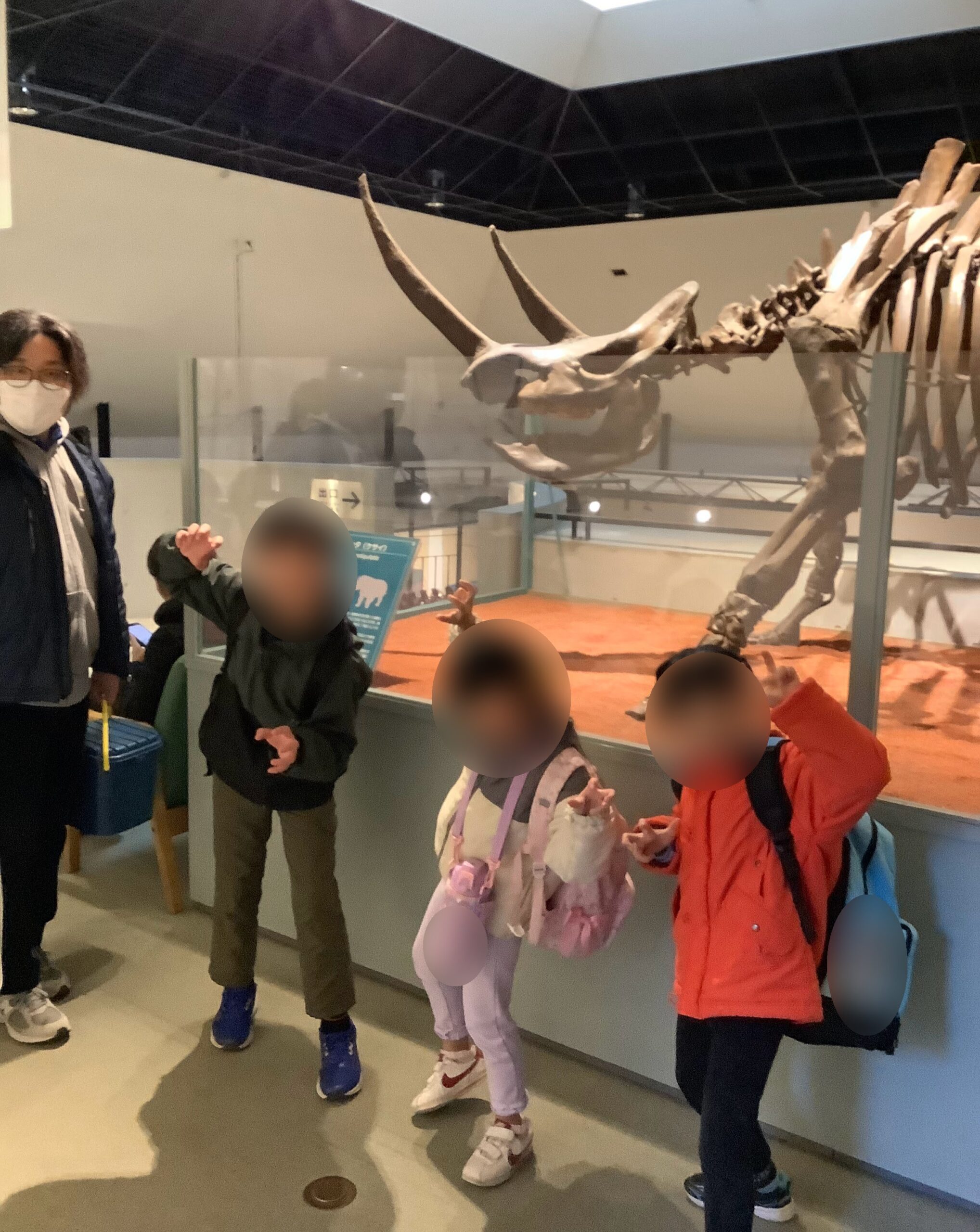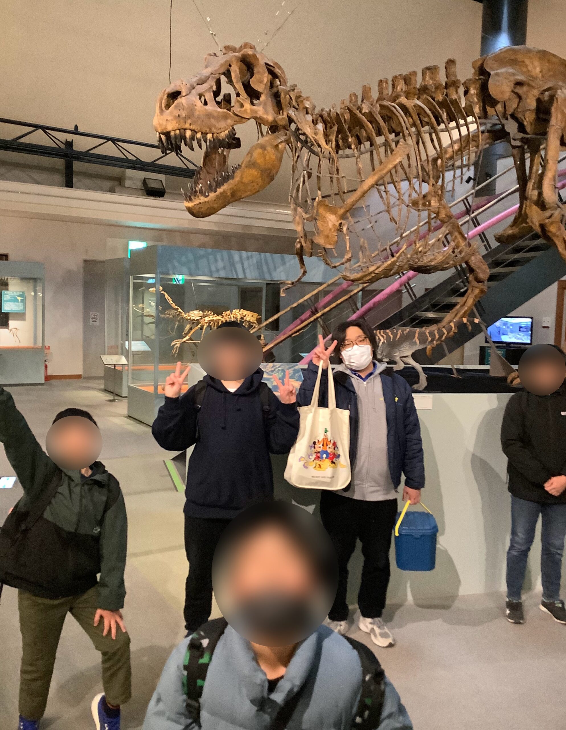 本物の化石に触れることもできたり、等身大の恐竜の骨格を興味津々で見ていた子供たちです☺