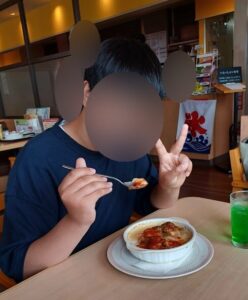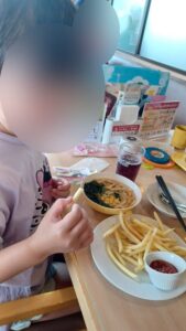 水遊びの前に、まずはジョイフルでご飯を食べます💪
