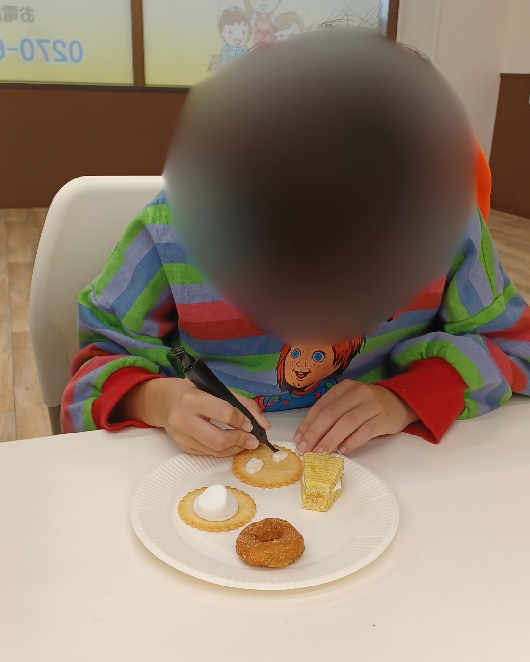 午後の活動2つ目は、お楽しみのハロウィンパーティー🥳配られたお菓子をチョコペンでハロウィン風にデコレーションしていただきます🥄マシュマロに目を描いてお化けにしたり、ドーナツにマーブルチョコを乗せ目玉にしたり、中にはすべてのお菓子を重ね合わせてお皿にチョコペンを垂らしフレンチ風にする子も…👀