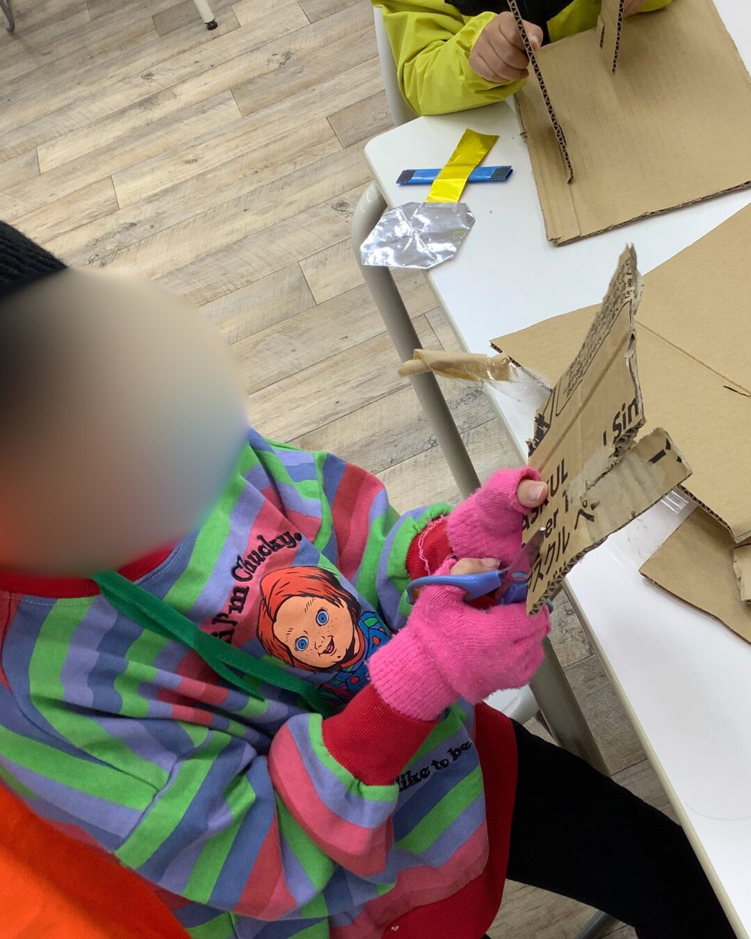 また、自由遊び中に段ボールや画用紙を使って猫のしっぽやチェンソーなど仮想グッズを作る子も!