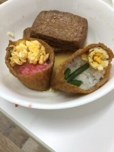 今回のいなり寿司は春らしく黄色やピンクの食材をのせたり、