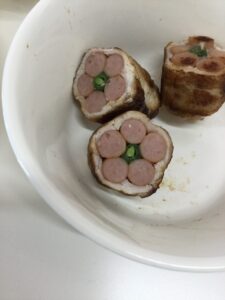 肉巻きは、ポークビッツとインゲンを豚肉で巻きました🌸