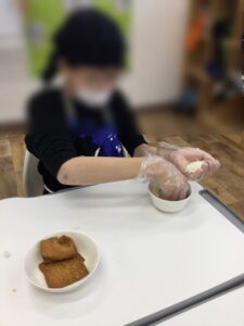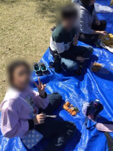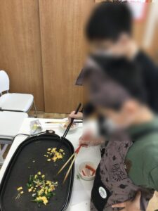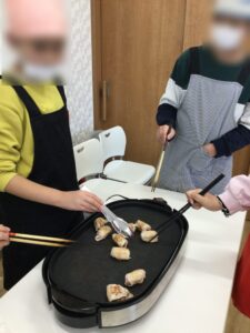 ホットプレートで焼き、半分にカットするのをみんなに任せました🙋
