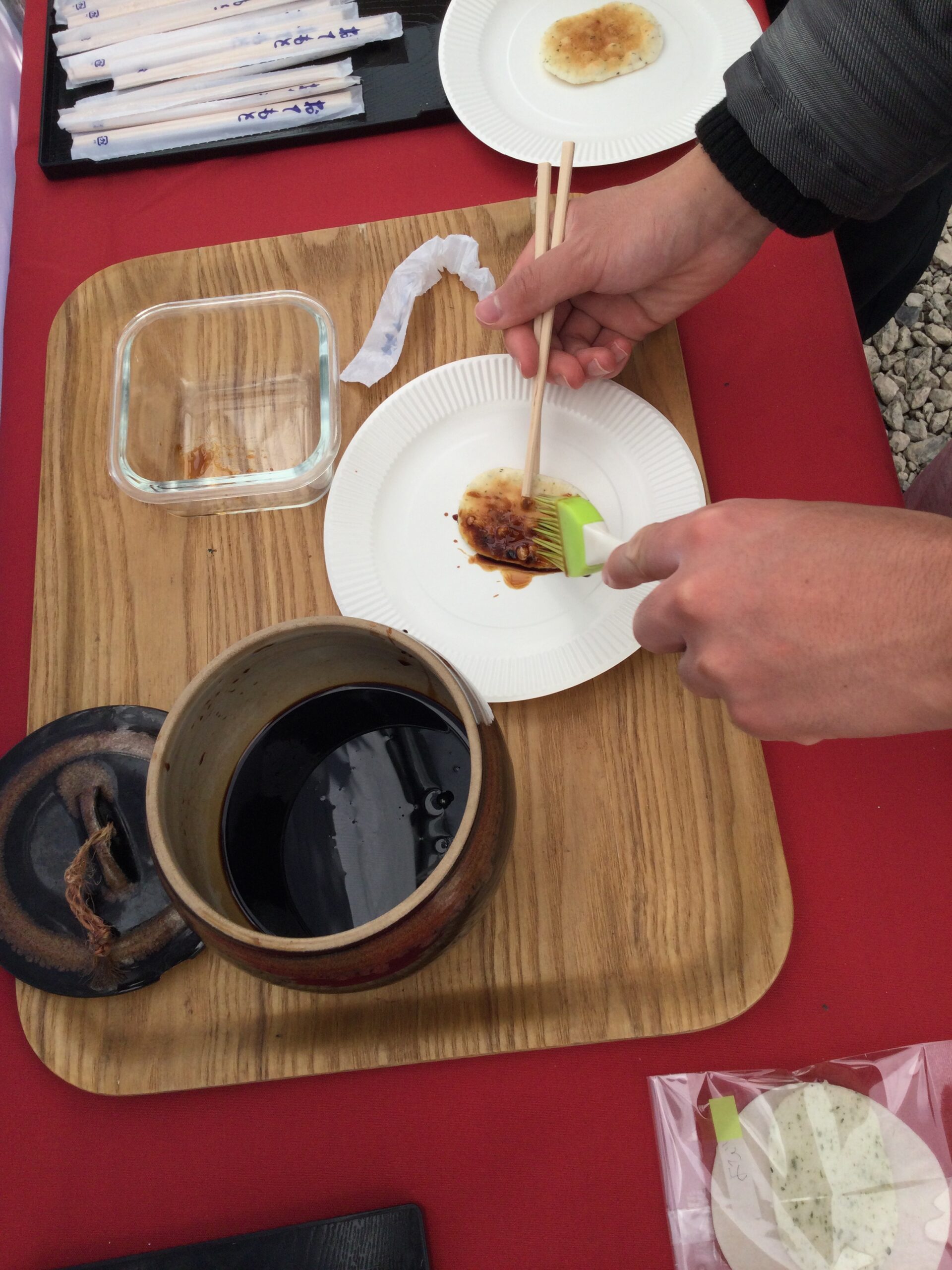 焼きあがったおせんべいに醤油を塗って、
