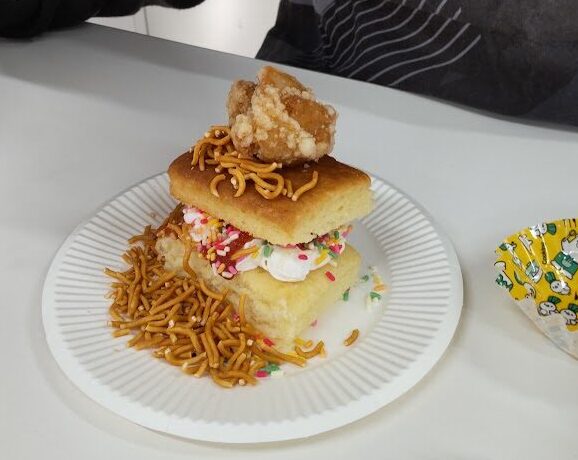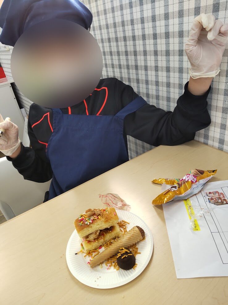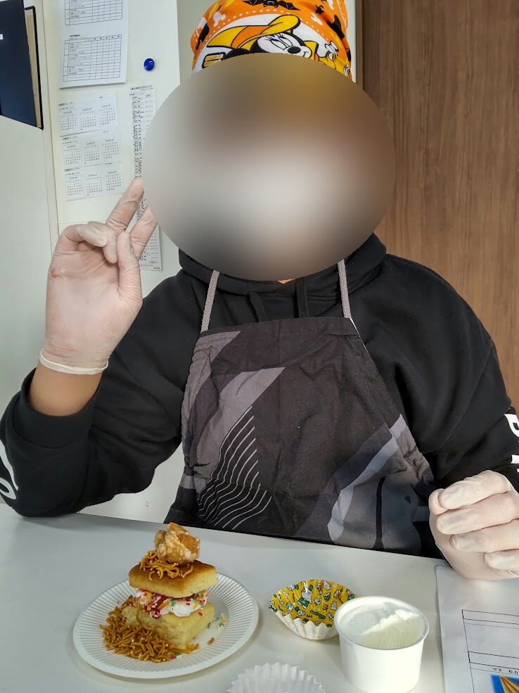 「ケーキに唐揚げ…」とツッコむ職員と、唐揚げを乗せられて嬉しそうな子どもたち😂
