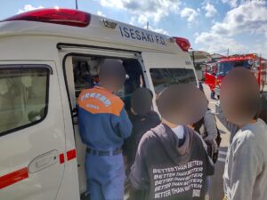 消防署に着くと、救急車やはしご車、ポンプ車、救助者が用意されていました。