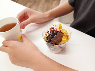 みんなでパフェを作り、頑張ったことを発表しながら