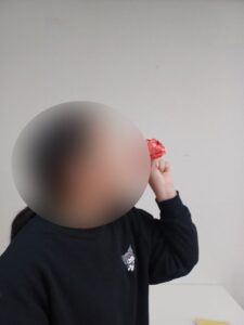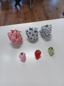 今すぐに食べたい!という気持ちを抑え、午前中は午後のいちご狩りを倍楽しめるように折り紙を使っていちご制作をしました!