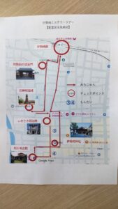 伊勢崎駅から出発し、旧時報鐘楼、いせさき明治館などなど、いくつかのチェックポイントを通りながら、ゴールの伊勢崎神社を目指します😄地図で道順を確認して、出発!