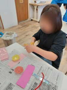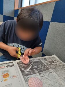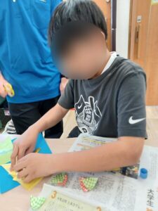 自分の席に座って、画用紙などの材料をハサミで切っていきましょう。