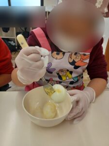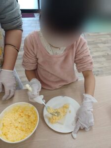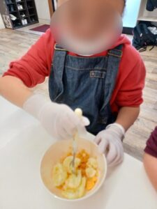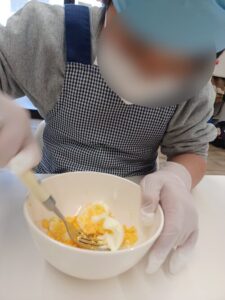 つづいて、ゆで卵をフォークの背でつぶしていきます🥚