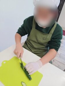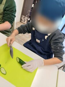 お兄さんたちは、包丁でキュウリを薄く切っています。