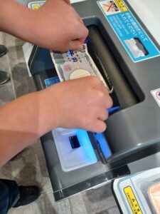 タッチパネルをタッチしたり、お札を伸ばして入れたり、
