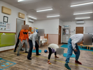 粗大運動では、ボールやプールスティックを使用してボディイメージや体の使い方を学びます。