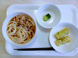 昼食  肉うどん、天ぷら、キュウリの浅漬け