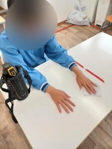時間になったら、手洗いをして、水筒を用意し、自分の机を綺麗に拭きます。