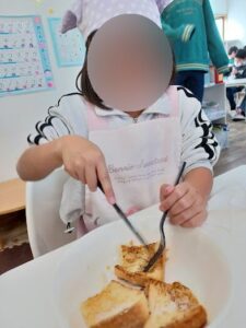 今回はフォークとナイフを用意して、上手に切って食べられるかな?というチャレンジもしてみました!
