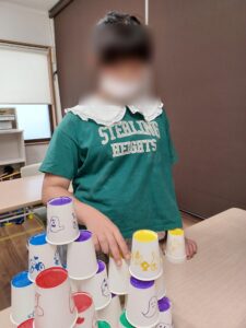 できるだけ高く積み上げることができるように、どこに置くのがいいか考えながら、紙コップを置いていきます!