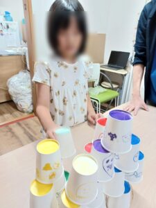 ぎゅうぎゅうゴーストでは、同じ色の紙コップをみつけて、倒さないように紙コップを慎重に積み上げていきます😮