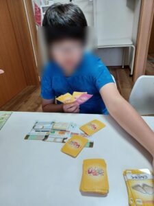 1人1枚の料理カードを持ち、それぞれの料理に必要な6枚の食材のカードを集めていきます。