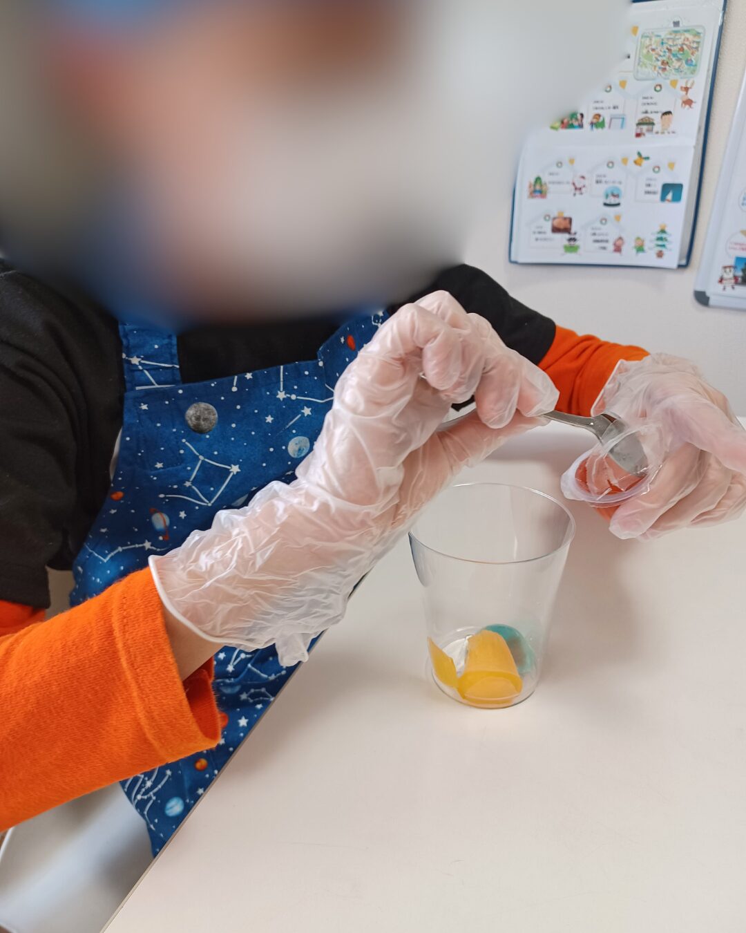 まずは食材を切っていきます🔪。バナナやカラフルなゼリーを切って容器に敷き詰めていきます。