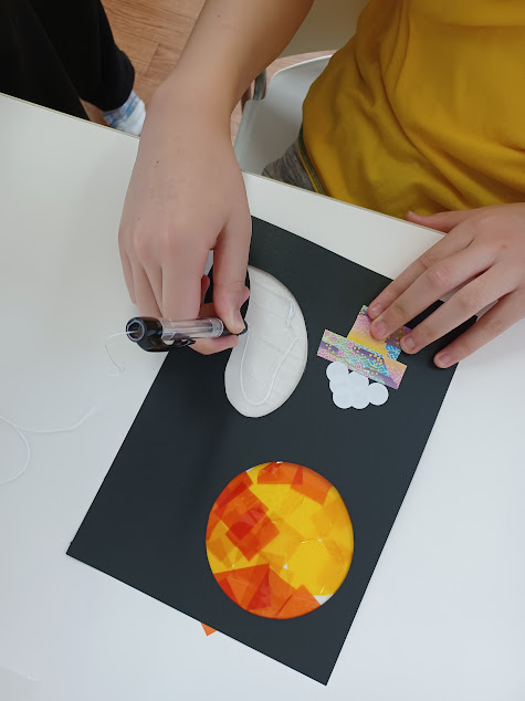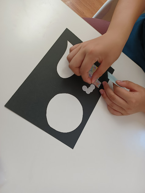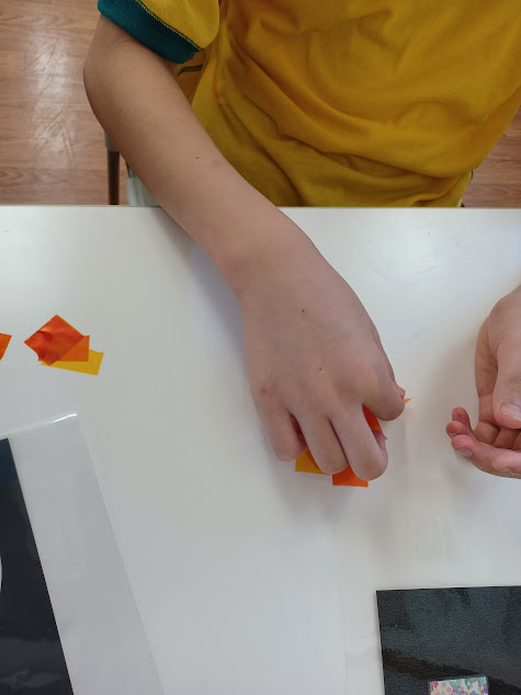 ハサミでセロハン紙を切り、丸く模った台紙に貼り付けます🌟