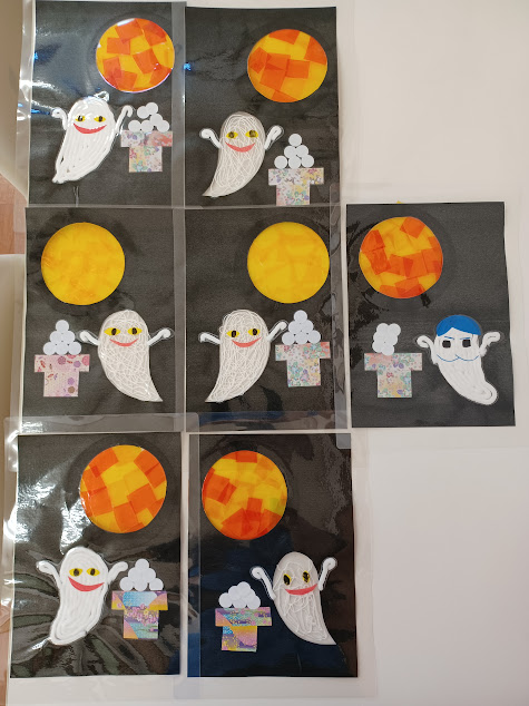 ペンの操作が難しい児童は、手でもこもこの毛糸を貼り付ましたが・・・こちらもとっても可愛い💑糸の素材でおばけちゃん👻の雰囲気もガラッと変わり、とっても素敵な作品が完成する予感・・・💕