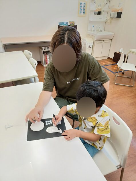 今回は、絵本の中に登場する【おばけ👻】を使って制作活動をするため、途中で【おばけ👻】に意識を向けられるよう声掛けを行いました😊📢