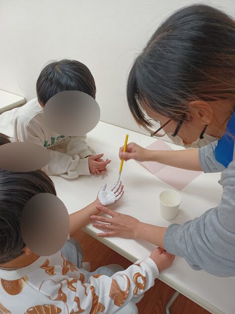 手のひらに絵の具をぬりぬりしていると・・・おやおや?見学さんが沢山来ましたね😂