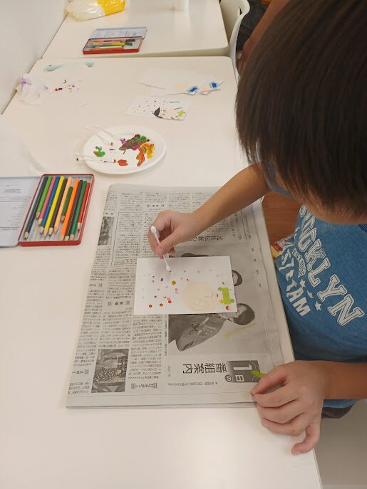 次は綿棒の先に絵の具をつけて、スタンプをしたり、