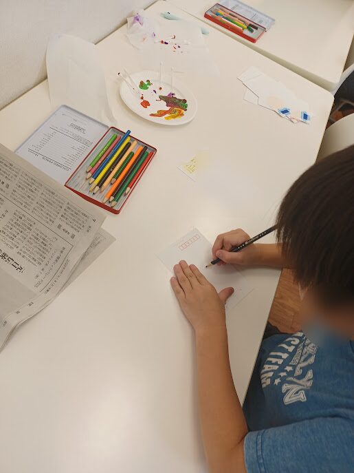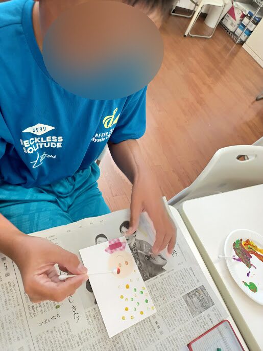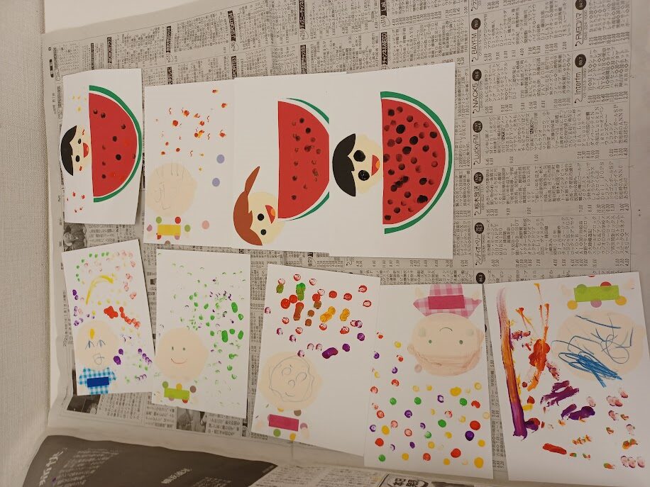 暑中見舞い制作2回目のお友だちは、黒い絵の具や丸シールでスイカの種を表現してもらいました🍉