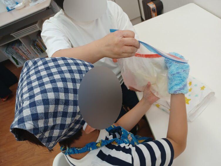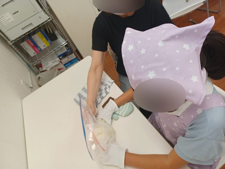 そして手袋を付けて凍傷を予防しながら、袋を揉んだり振ったりしてアイス液の温度を下げていきます😊✨