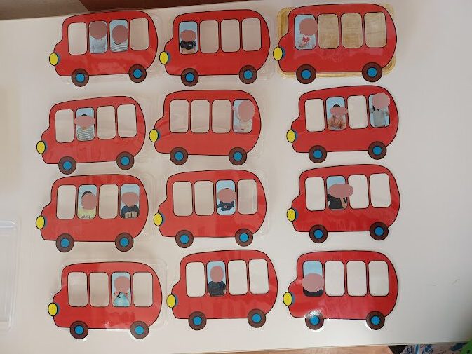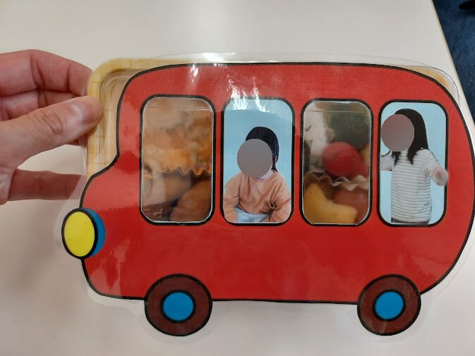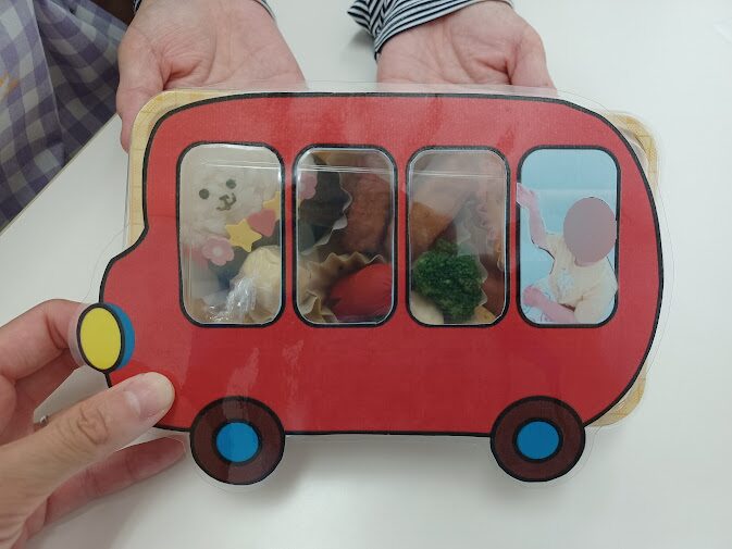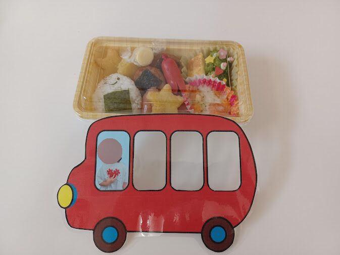 今回のテーマは【おべんとうバス🚌】なので、絵本に出てくる赤いバス🚌に子ども達の写真を貼り付け、子ども達が「ごはん🍚」達と楽しくドライブしている様子を表現しました😂💓