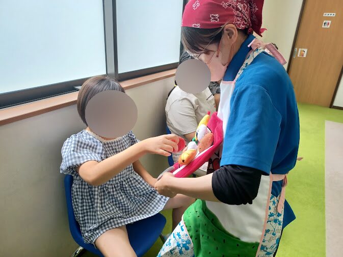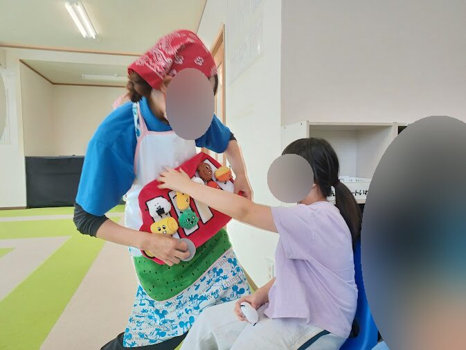 当日はエプロンシアターで活動の導入を行い、食育のお約束💡を確認してからエプロン・マスク・三角巾の身支度を整えました。
