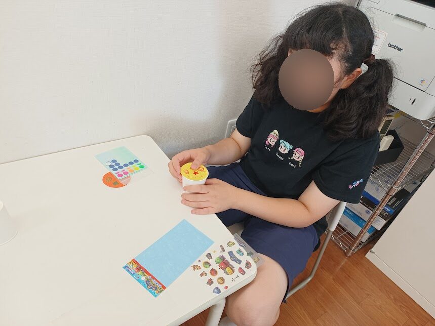 紙コップの形に丸く画用紙を切り、自由にお絵かきやシールで飾り付けをします😌💕