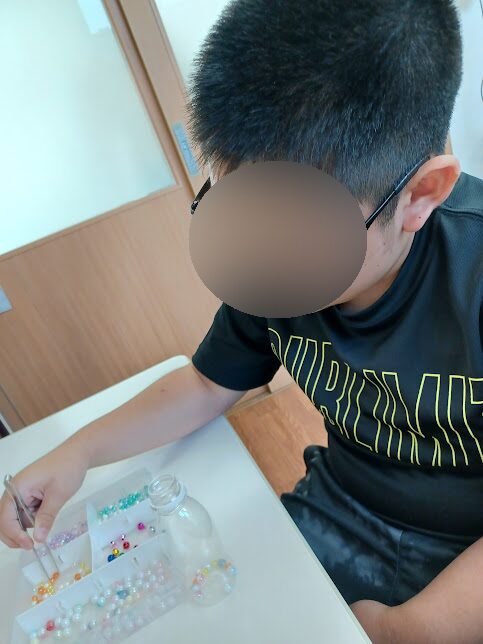 今回の制作では小さいビーズを使用したため、ピンセットで掴むのは難しいかな…?と考えていましたが、予想以上にピンセットの扱いが上手で驚きました😯✨毎日、ピンセットだけでなく、ひも通しや洗濯ばさみ、お箸の微細活動など様々な指先のトレーニングを通して、子ども達は指先の力や集中力が身についているようです👏